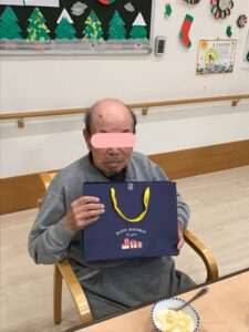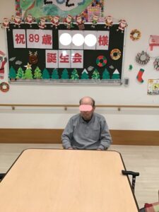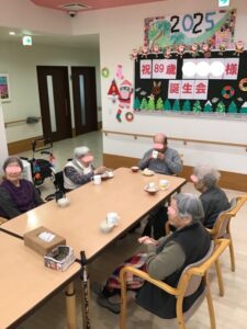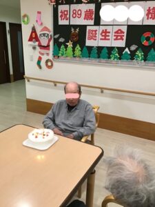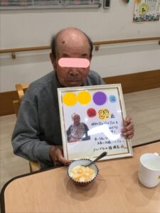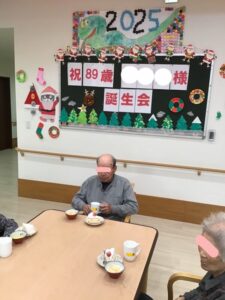12月の誕生会2025年12月14日 12月11日に89歳になられる利用者様の誕生会を行いました。 椿から色紙と誕生日プレゼントを贈りました。 皆さんに祝ってもらい、喜んでおられました。 いつまでもお元気にお過ごし下さい。