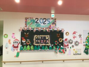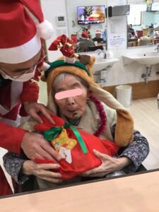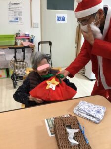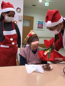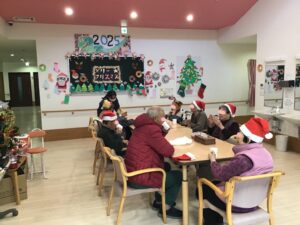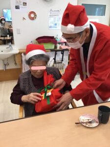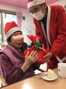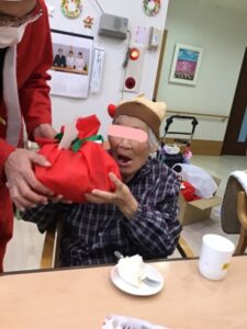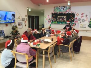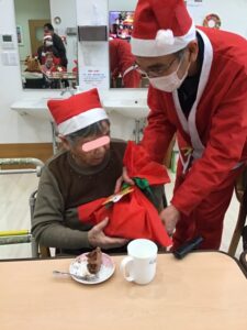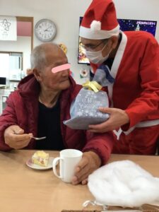 クリスマス会2025年12月30日 12月25日に、クリスマス会を行いました。 昼食とケーキです。 ケーキを食べてる時に、サンタクロースが登場、一人一人にプレゼントが渡された。 驚かれ、喜んでおられました。