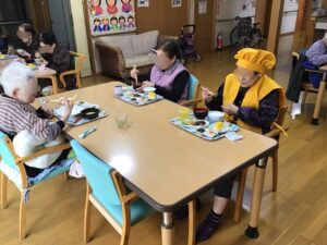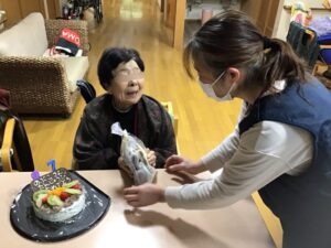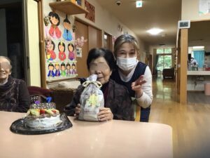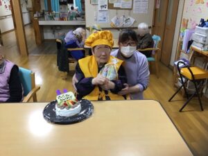 先日2月15日に88歳、2月20日に87歳を迎えられた利用者様の誕生日会を2月24日に2名合同で行いました😊88歳を迎えられた利用者様には米寿という事で黄色のちゃんちゃんこを着て頂きました😄